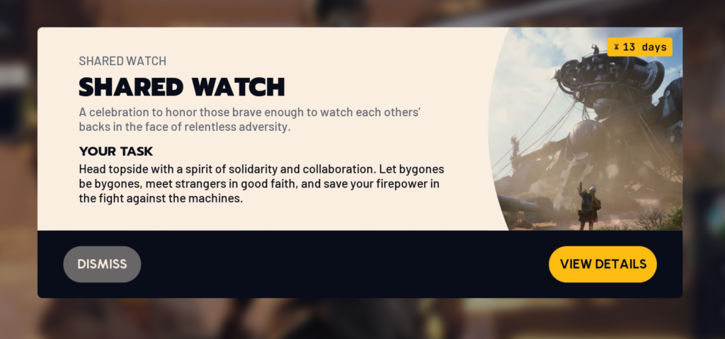 The Shared Watch Event starts today and ends on February 24. Players will earn merits from destroying, assisting and damaging ARC and earn rewards. No merits will be earned from PvP encounters. Bring a friend or bring a stranger, but above all, bring enough ammo to make sure the machines notice you first.